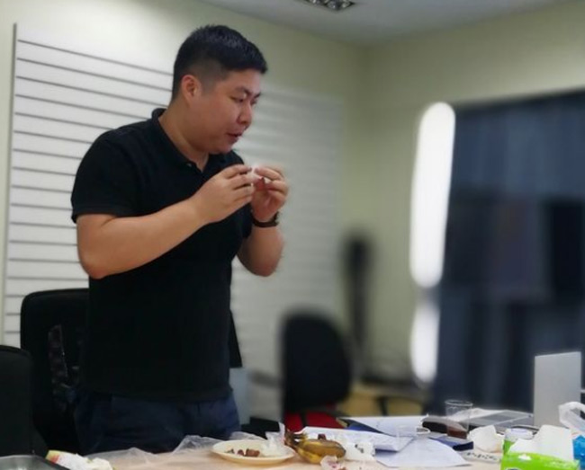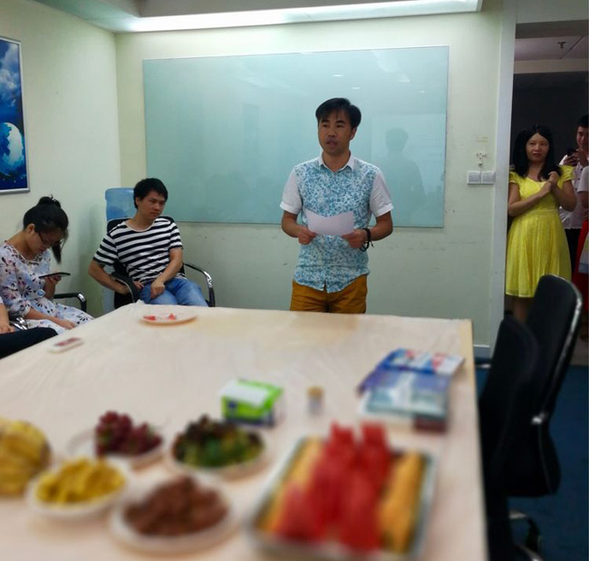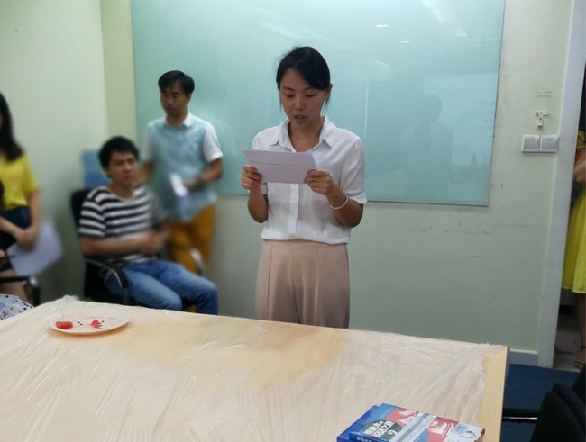 总部下午茶火热进行的同时,火炼树办公的同事的下午茶活动也如期举行,他们把几张桌子拼成一个大桌,铺上红布,摆满食物,主持人用手提电脑替代了屏幕,活动中你一段我一段的文章朗诵、你一题我一题的踊跃抢答照样精彩,相比总部稍为简陋的办公环境并不能削减大家对下午茶活动的参与热情。