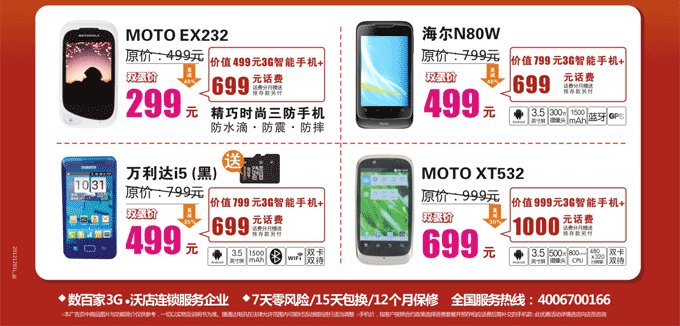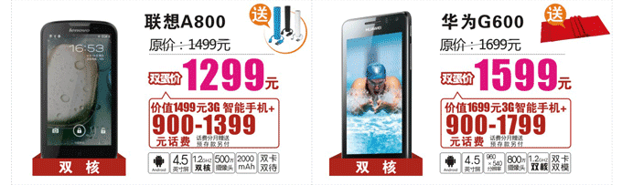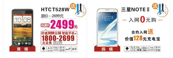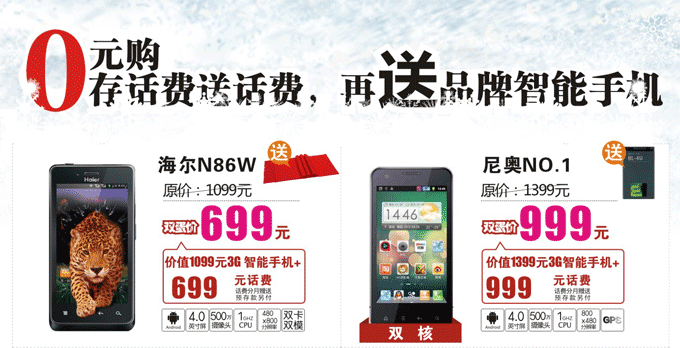 4、预存话费0元购机,4寸大屏、双核智能手机预存话费免费送;