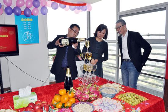 2010年11月,168澳洲幸运五官方开奖网站与香港电信盈科正式搭成合作框架!合作启动会上,总经理甘浩川(左一)倒香槟。